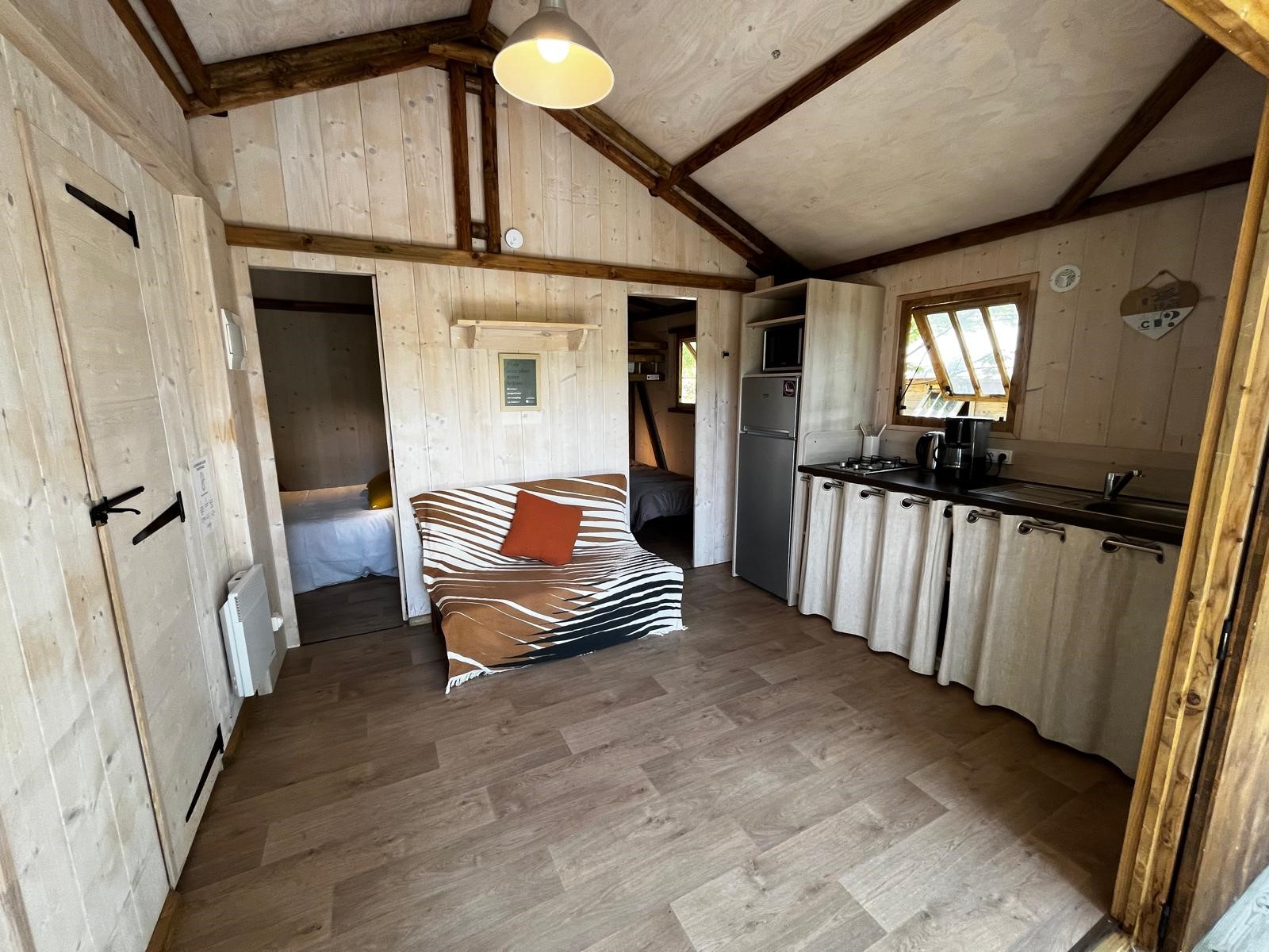Need comfort without losing the charm of the outdoors? This spacious lodge is perfect for large families or stays with friends. With its three beds in the second bedroom, its Nespresso coffee maker and its large wooden terrace, it perfectly combines comfort and nature. After a day of exploring, sit in the sun or enjoy a quiet moment on the terrace... luxury in the countryside.