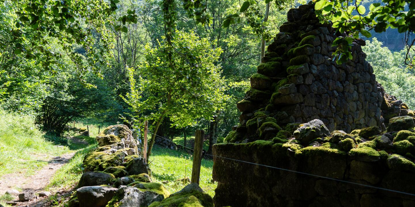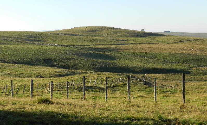 Entrer dans le bois en empruntant le sentier légèrement à droite (derrière le centre de remise en forme). 20 m plus loin, bifurquer à droite (360°) vers le sentier qui monte. Laisser les deux sentiers suivants sur votre gauche et poursuivre vers la droite en descendant. Au croisement, prendre le sentier à gauche (360°) en montant. A l’entrée du virage, tenir votre gauche jusqu’à la sortie du bois. Longer la pâture en direction de la sapinière et du buron situé au sommet de la montagne de Pleau. Arrivé au Buron, vous découvrirez au Nord les Monts du Cantal (de droite à gauche : le Plomb du Cantal, le Puy Griou et le le Puy Mary) ; au premier plan : le bourg de Mur et le château de Venzac ; à l’Est, les monts de l’Aubrac.