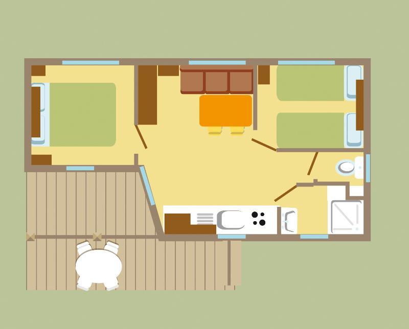 Envie de vacances simples et ressourçantes ? Ce mobil-home Confort de 23 m² est idéal pour une petite famille ou un duo d’amis en quête de tranquillité. Avec sa terrasse couverte, ses deux chambres bien pensées et son espace de vie fonctionnel, il a tout pour plaire. Après une journée au bord du lac ou sur les sentiers de randonnée, installez-vous dehors pour profiter des derniers rayons du soleil… en toute simplicité.